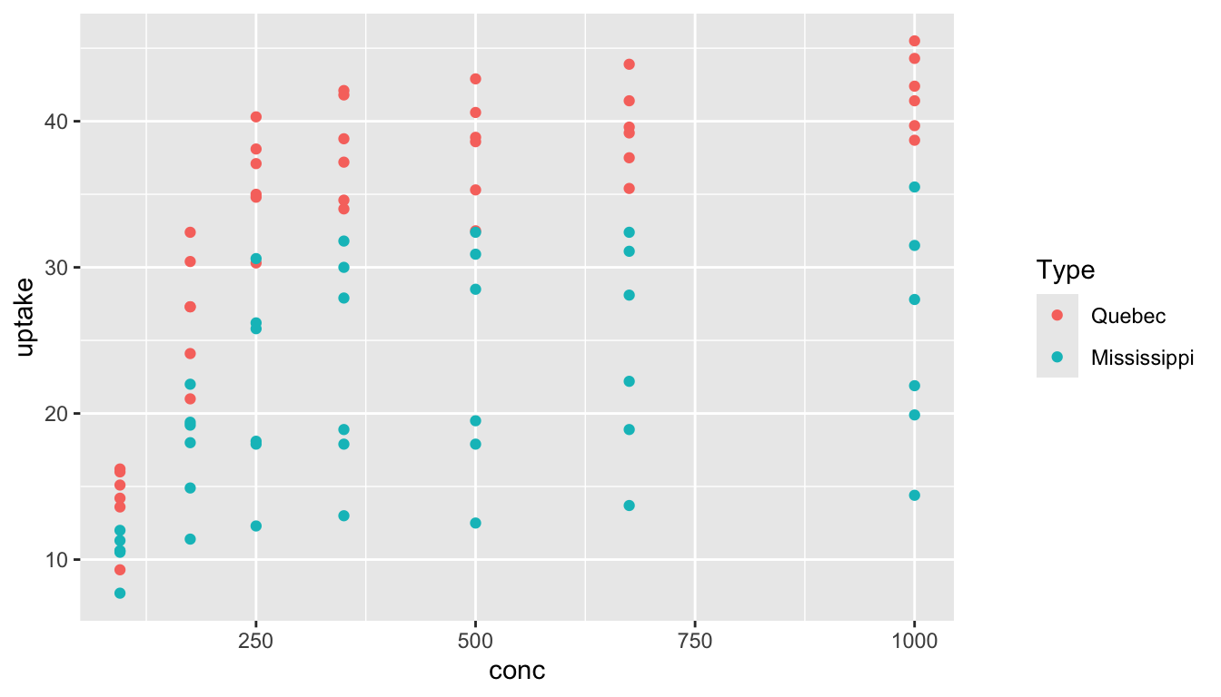 ggplot(CO2, aes(conc, uptake, color = Type)) + geom_point() +
