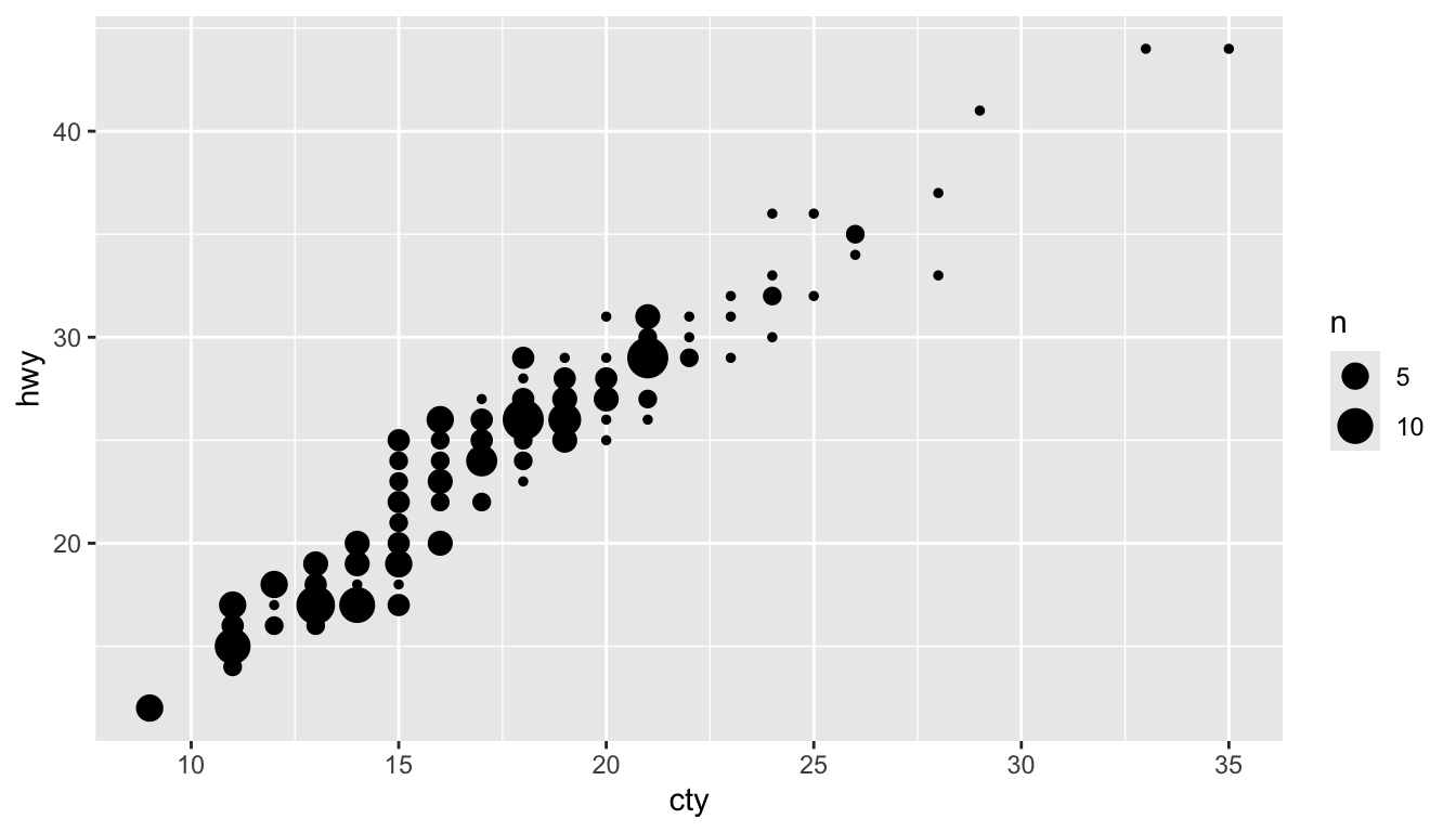 Gadījumos, kad nepieciešams attēlot izkliedes diagrammu, bet ir vērojama punktu pārklāšanās (pie vienādām x un y vērtībām ir vairāki novērojumi), var izmantot geom_count(), kas parāda cik daudz novērojumu ir konkrētajām x un y vērtībām (3.20 attēls).