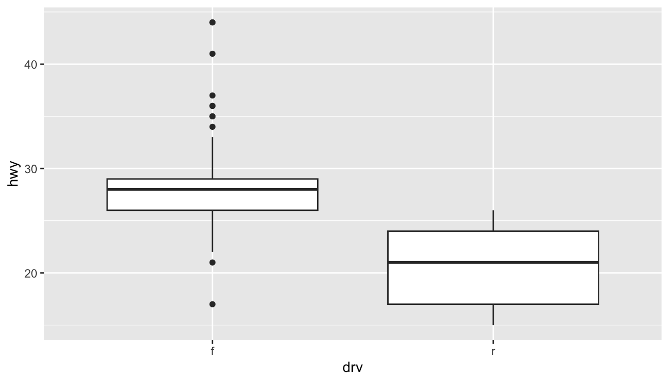 ggplot(mpg, aes(drv, hwy)) + geom_boxplot() +
