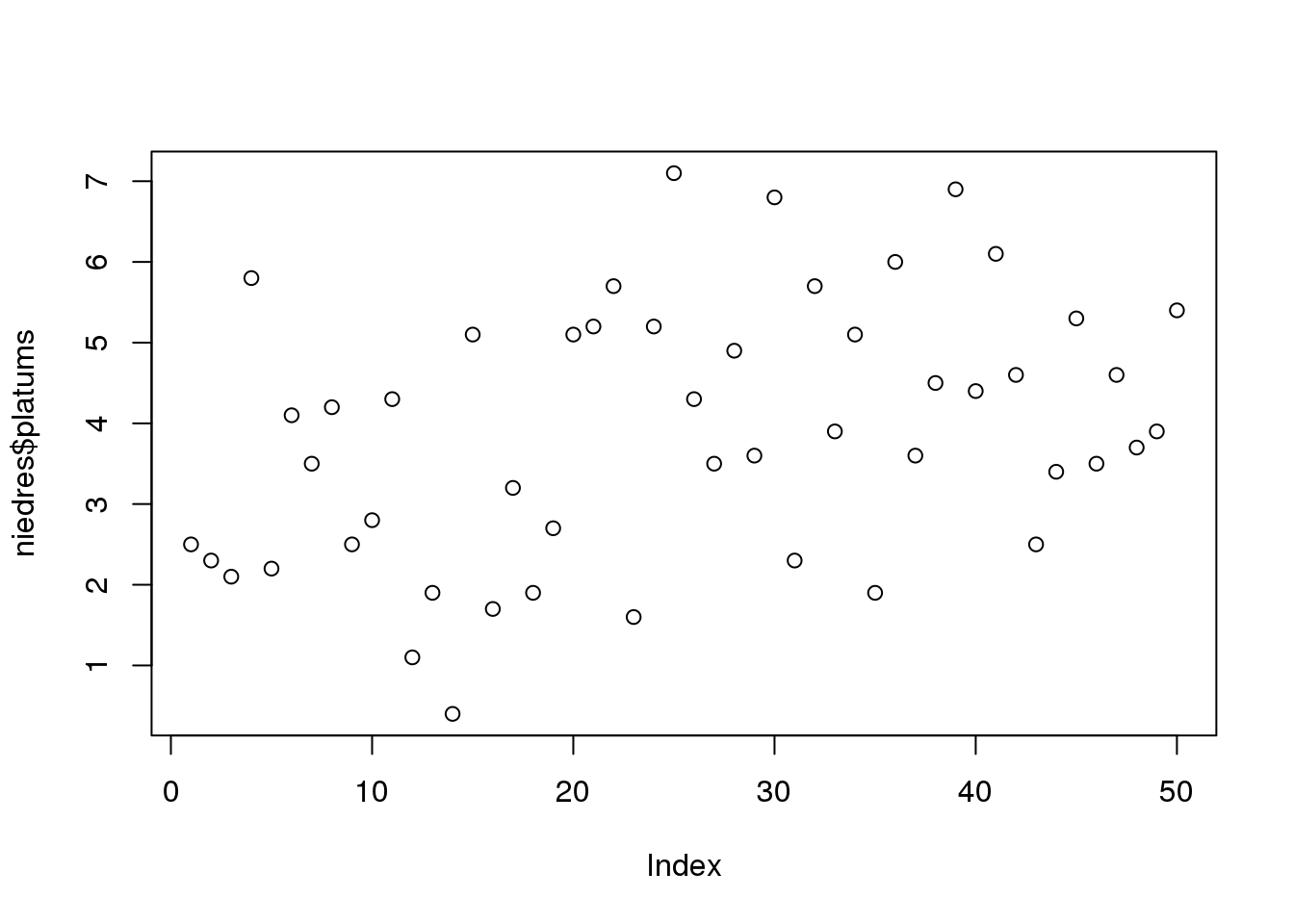 with(niedres,plot(platums))Ja ir nepieciešams uz x un y ass attēlot divu mainīgo datus, tad ir divi iespējamie risinājumi: (a) kā pirmo argumentu raksta uz x ass attēlojamo mainīgo, tad komats un uz y ass attēlojamais mainīgais; (b) kā pirmo raksta uz y ass attēlojamo mainīgo, tad tildes zīme ~ un uz x ass attēlojamais mainīgais. Abi varianti izveido identisku grafiku (4.5 attēls).